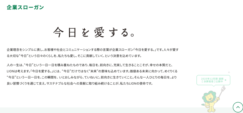 ライオンの企業キャッチコピーは、「今日を愛する。」です。日用品メーカーとして、人々の何気ない日常や毎日の生活そのものを肯定し、寄り添う姿勢を温かく示しています。